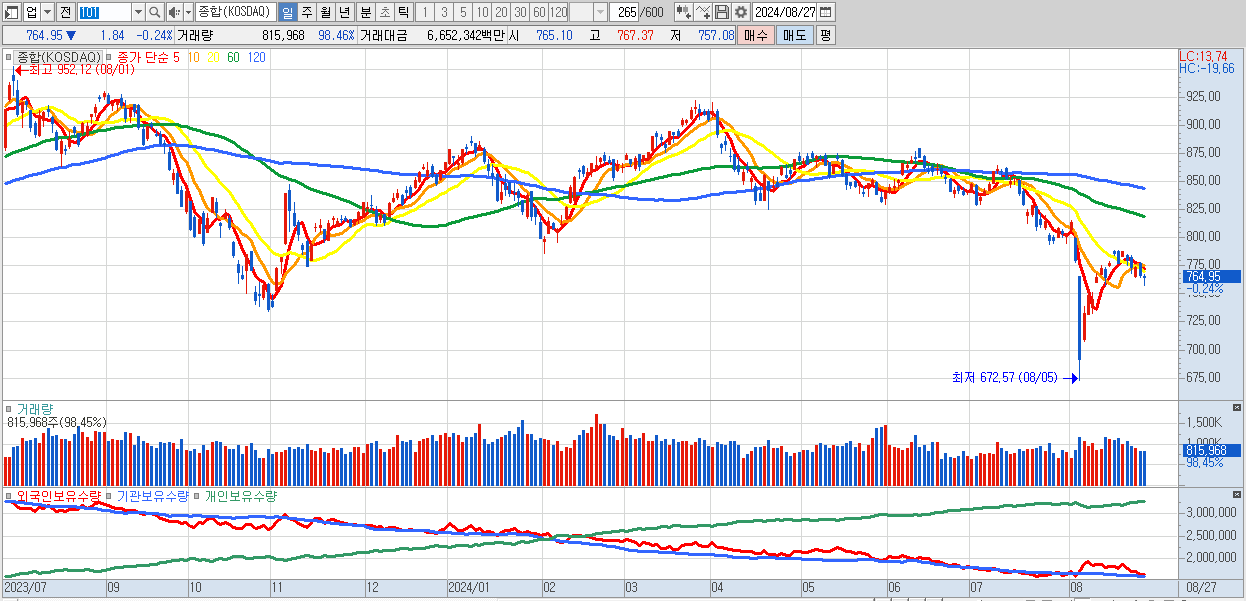 | 08/27 | 764.95 | ▼-0.24% | 865억 | -11억 | -777억 | -77억 |