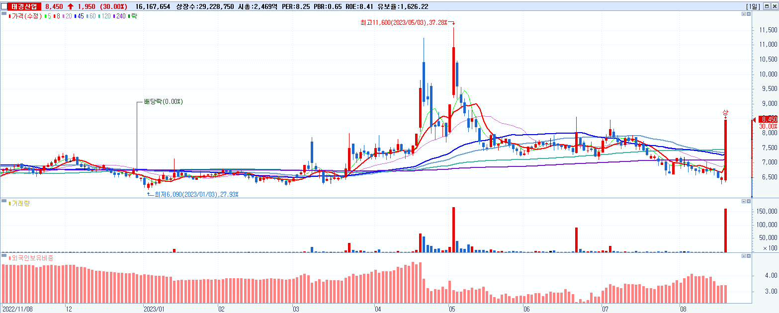 1.태경산업 8,450원 ▲ 30% (KOSPI, 015890)