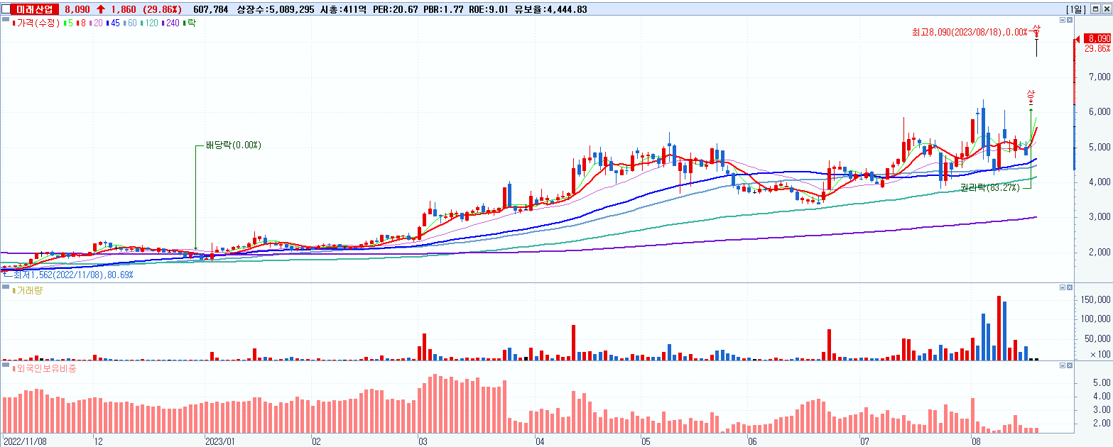 - 미래산업 (8,090원 ▲ 29.86% , 시총: 412억, 거래량: 607,968, 거래대금:49억)