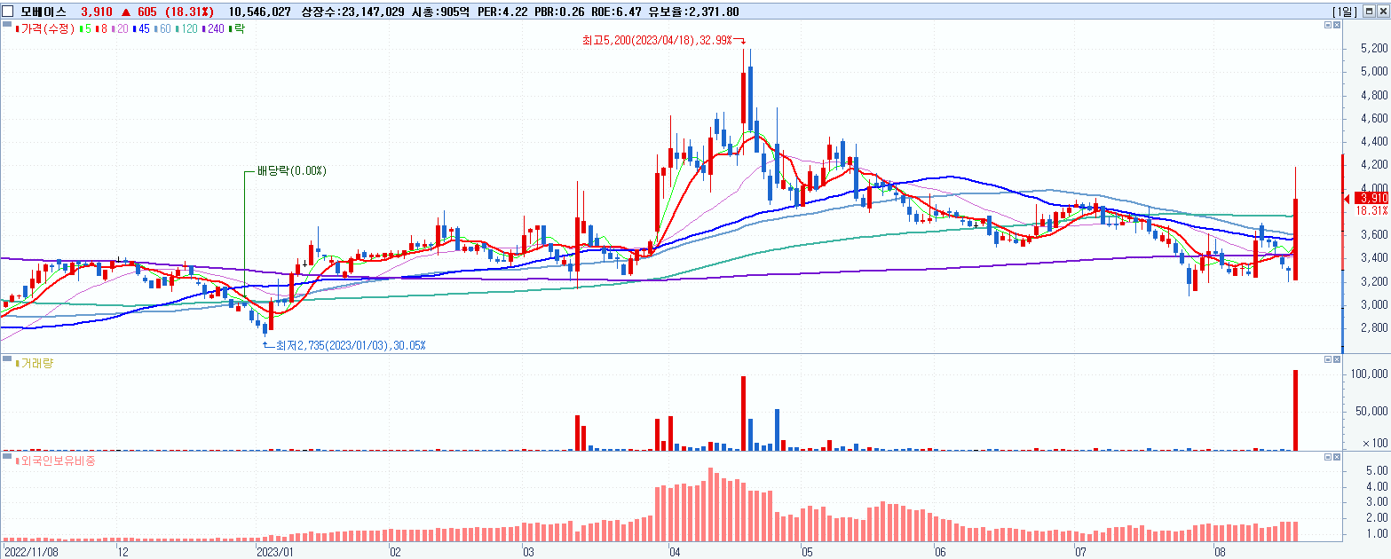 - 모베이스 (3,910원 ▲ 18.31% , 시총: 905억, 거래량: 10,553,798, 거래대금:421억)