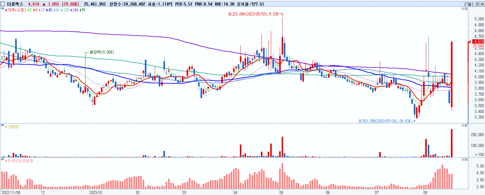 - 티플랙스 (4,610원 ▲ 29.68% , 시총: 1,119억, 거래량: 25,478,479, 거래대금:1,087억)