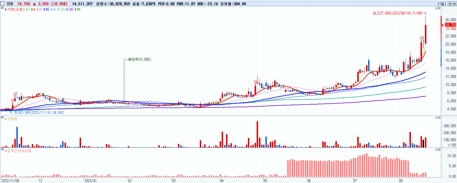- STX (24,750원 ▲ 18.99% , 시총: 7,630억, 거래량: 14,542,713, 거래대금:3,542억)