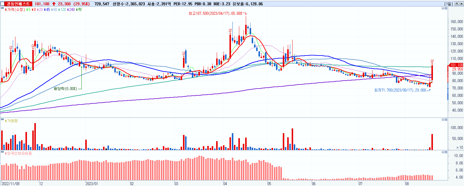 - 경동인베스트 (101,100원 ▲ 29.95% , 시총: 2,391억, 거래량: 720,573, 거래대금:678억)
