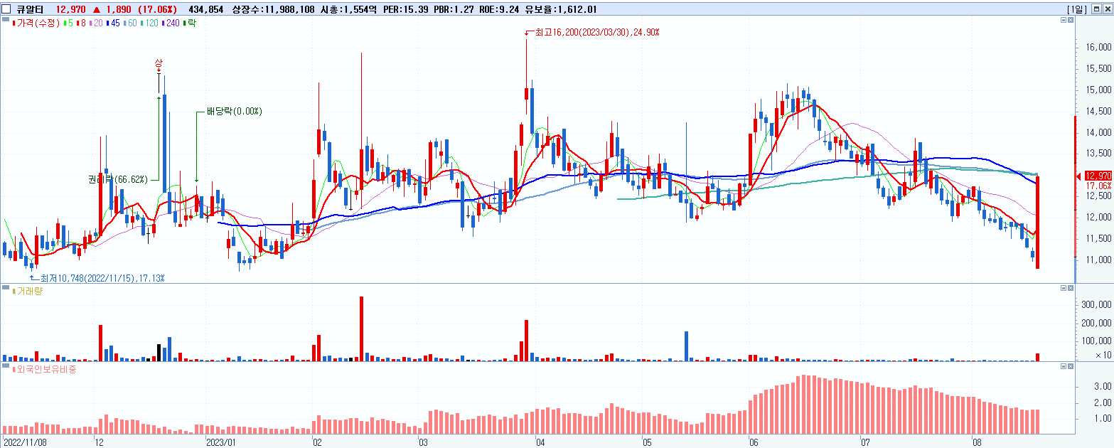 - 큐알티 (12,970원 ▲ 17.06% , 시총: 1,555억, 거래량: 446,025, 거래대금:55억)