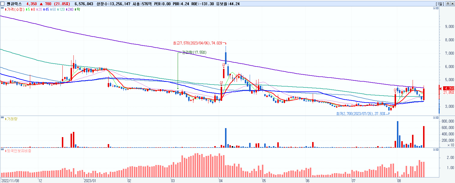 - 젠큐릭스 (4,350원 ▲ 21.85% , 시총: 577억, 거래량: 6,585,888, 거래대금:278억)