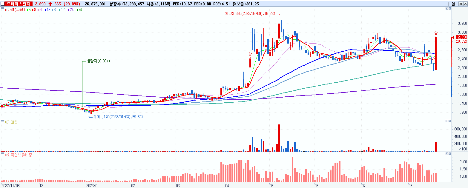 - 모베이스전자 (2,890원 ▲ 29.89% , 시총: 2,116억, 거래량: 26,899,751, 거래대금:748억)