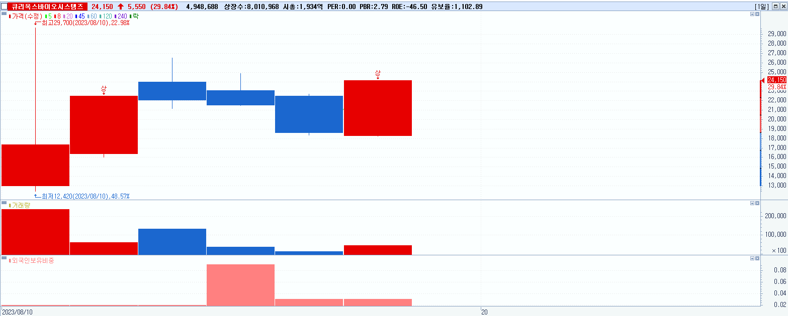 - 큐리옥스바이오시스템즈 (24,150원 ▲ 29.84% , 시총: 1,935억, 거래량: 4,948,803, 거래대금:1,090억)