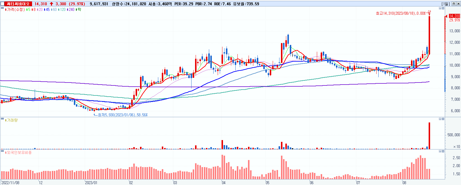 - 씨티씨바이오 (14,310원 ▲ 29.97% , 시총: 3,460억, 거래량: 9,618,532, 거래대금:1,291억)