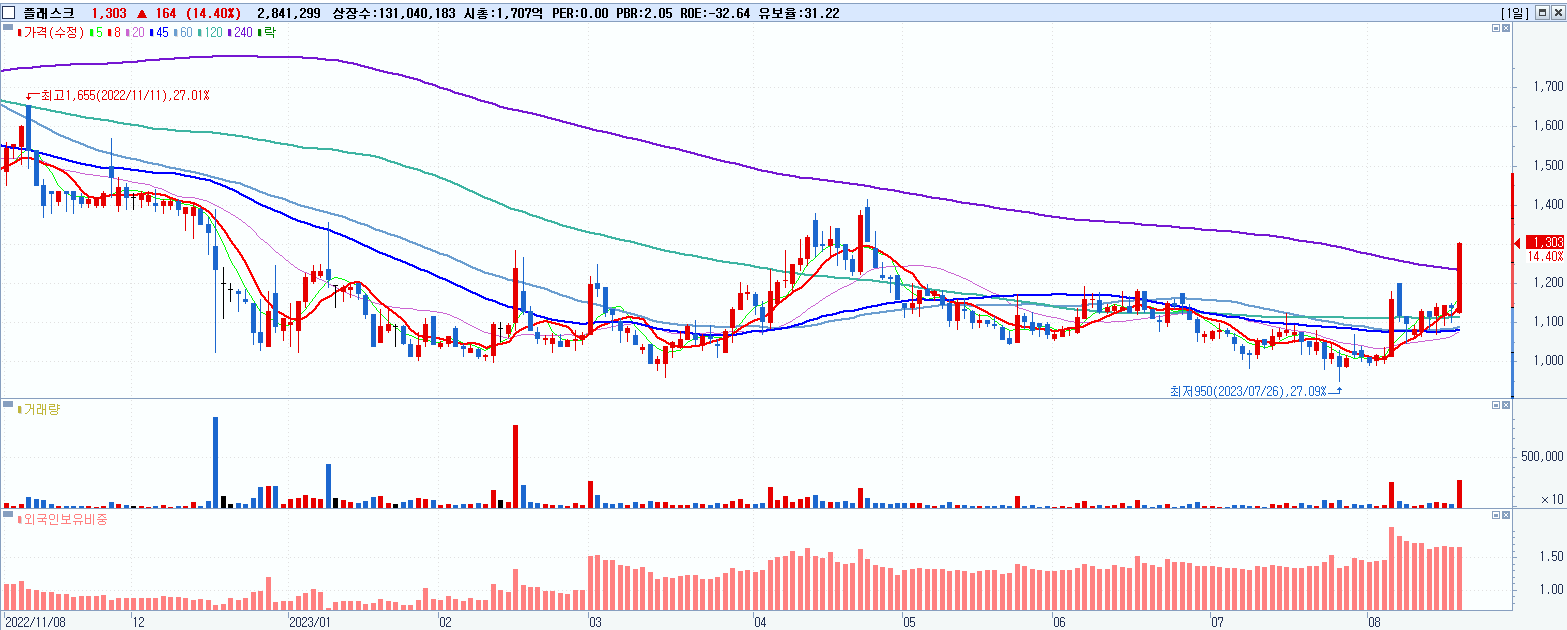- 플래스크 (1,303원 ▲ 14.4% , 시총: 1,707억, 거래량: 2,841,479, 거래대금:35억)