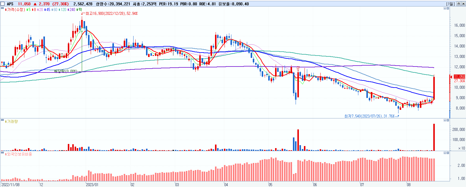 - APS (11,050원 ▲ 27.3% , 시총: 2,254억, 거래량: 2,567,081, 거래대금:272억)