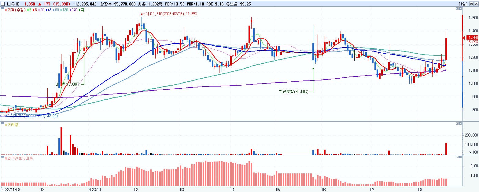 - 나우IB (1,350원 ▲ 15.09% , 시총: 1,293억, 거래량: 12,293,589, 거래대금:163억)