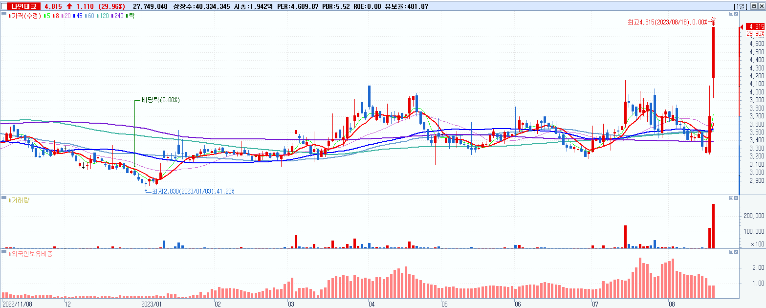 5.나인테크 4,815원 ▲ 29.96% (KOSDAQ, 267320)