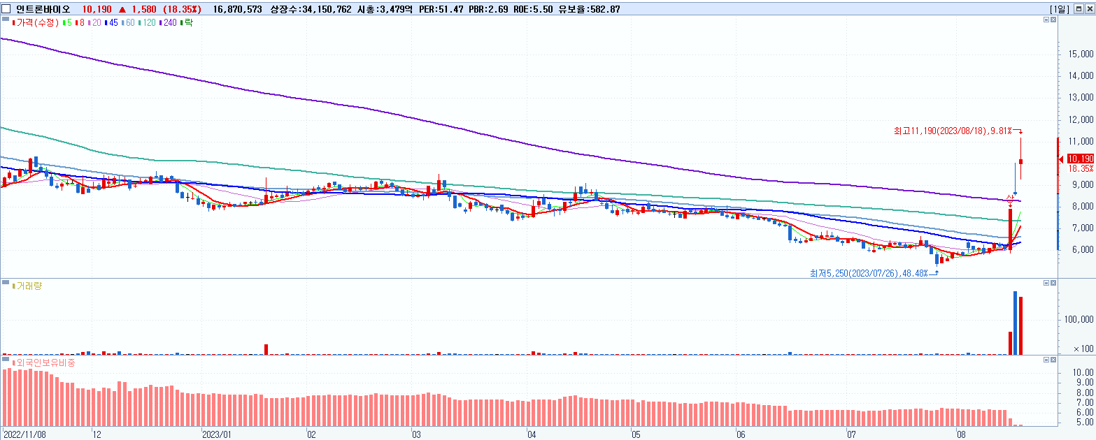 - 인트론바이오 (10,190원 ▲ 18.35% , 시총: 3,480억, 거래량: 16,967,343, 거래대금:1,760억)