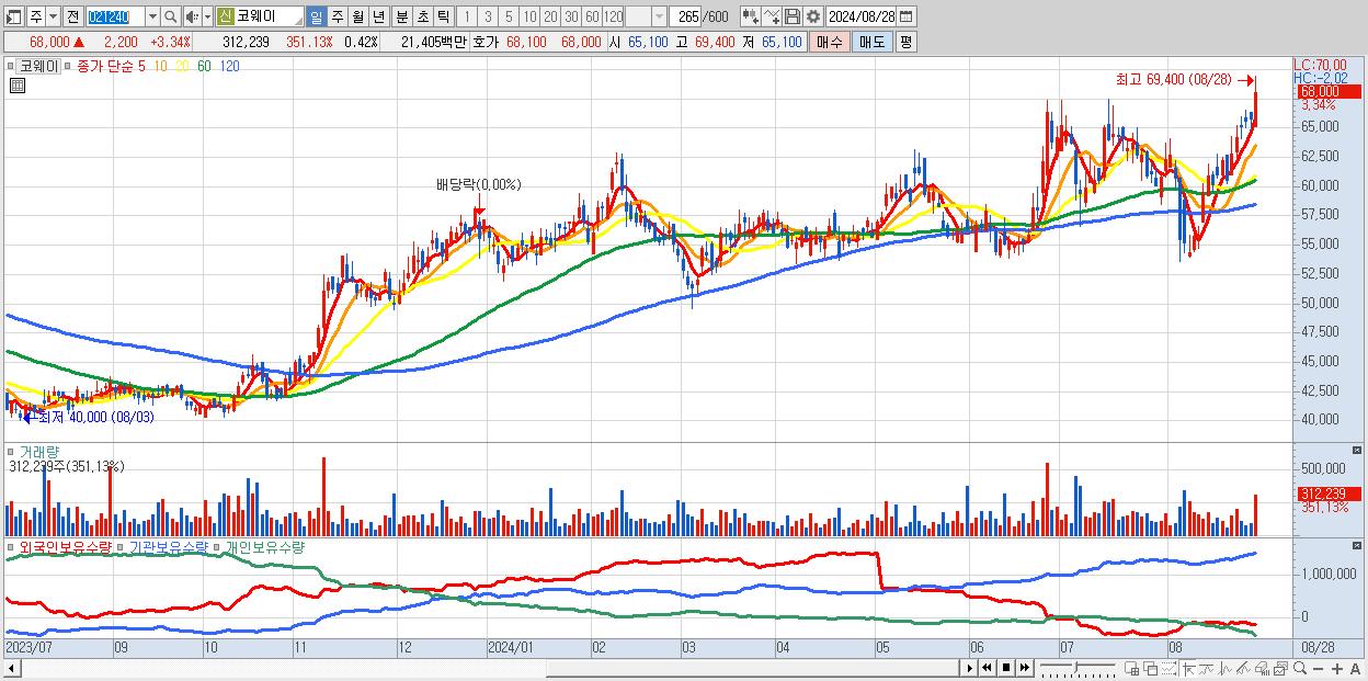 - 코웨이 (68,000원 ▲ 3.34% , 시총: 50,184억, 거래량: 312,239, 거래대금:214억, KOSPI)