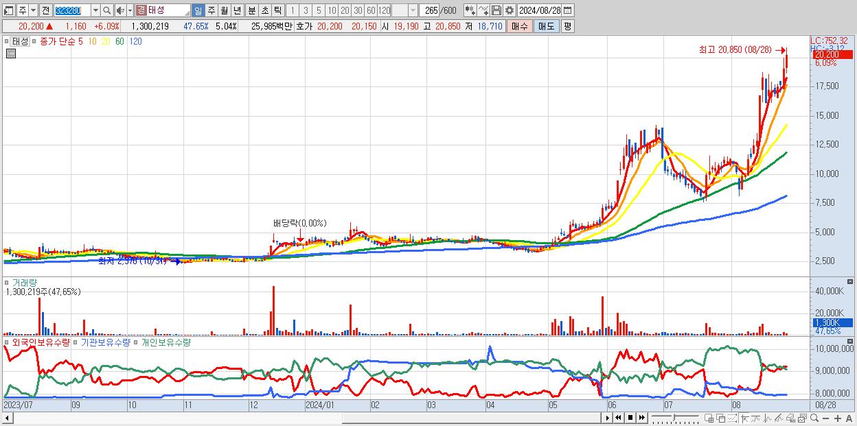 - 태성 (20,200원 ▲ 6.09% , 시총: 5,216억, 거래량: 1,300,219, 거래대금:260억, KOSDAQ)
