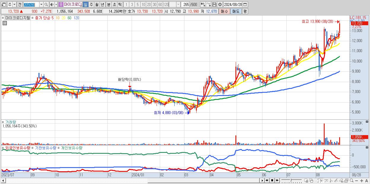 - 마이크로디지탈 (13,720원 ▲ 7.27% , 시총: 2,168억, 거래량: 1,056,164, 거래대금:143억, KOSDAQ)