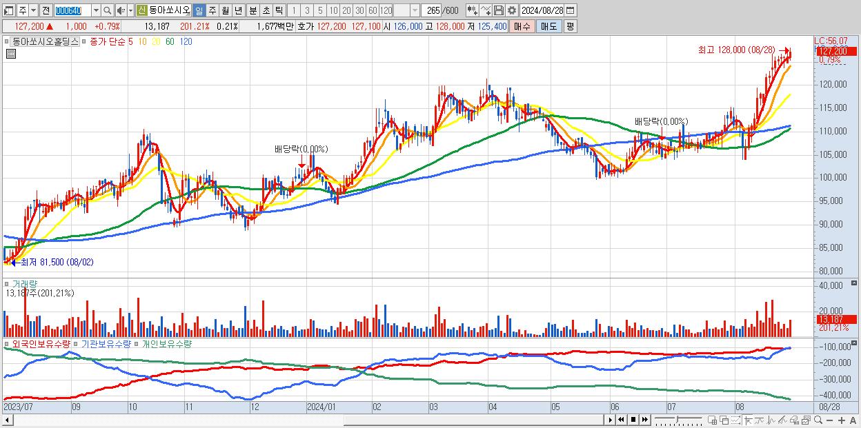동아쏘시오홀딩스 127,200원 ▲ 0.79% (KOSPI, 000640)
