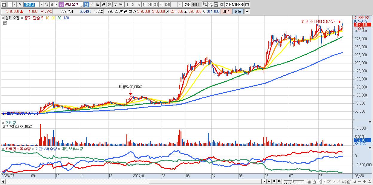 - 알테오젠 (319,000원 ▲ 1.27% , 시총: 169,544억, 거래량: 707,761, 거래대금:2,263억)