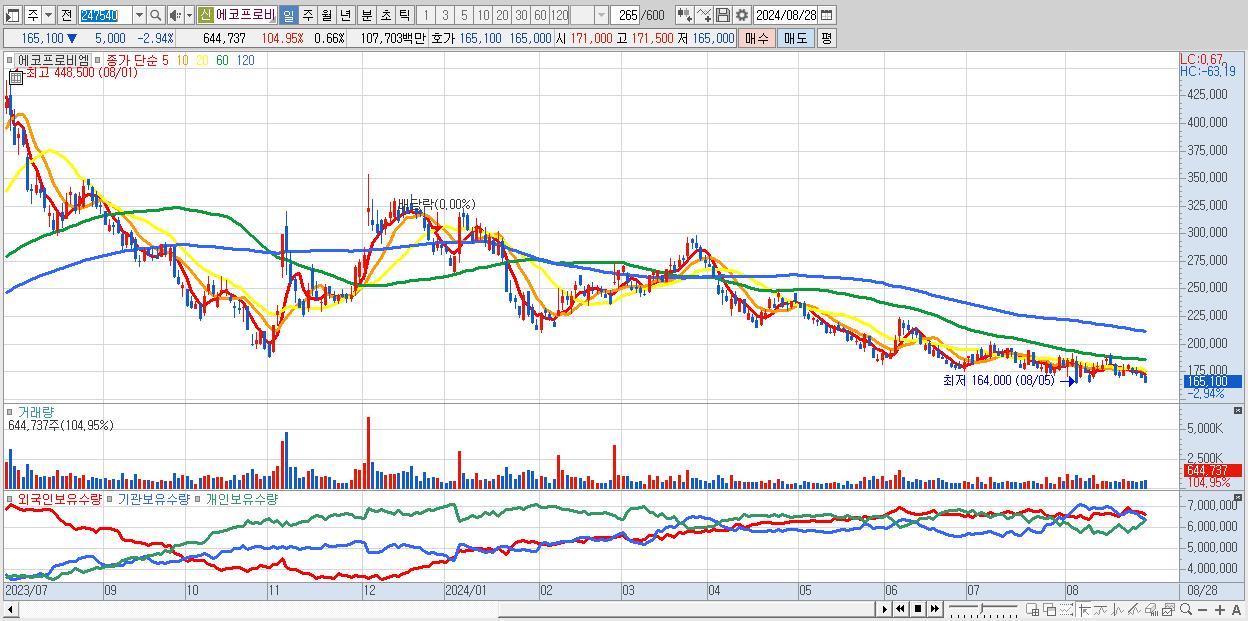 - 에코프로비엠 (165,100원 ▼ -2.94% , 시총: 161,470억, 거래량: 644,737, 거래대금:1,077억)