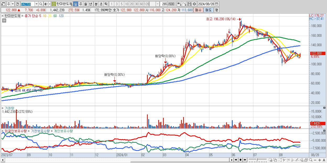 - 한미반도체 (122,800원 ▲ 6.69% , 시총: 119,108억, 거래량: 1,442,239, 거래대금:1,730억)