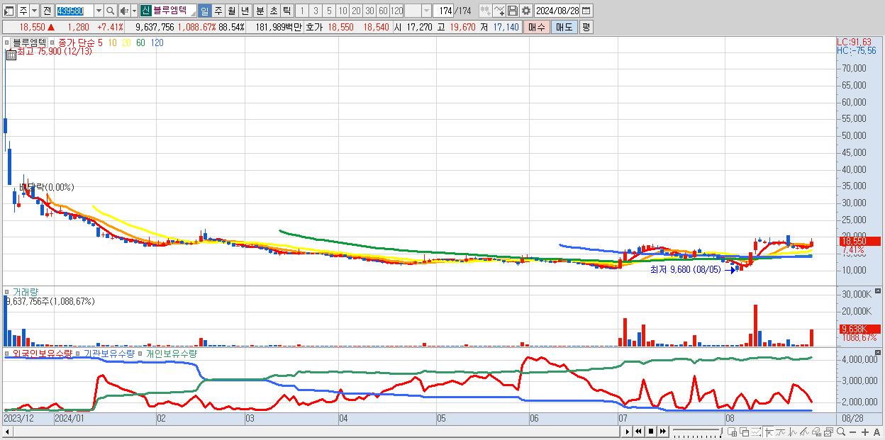- 블루엠텍 (18,550원 ▲ 7.41% , 시총: 2,019억, 거래량: 9,637,756, 거래대금:1,820억)