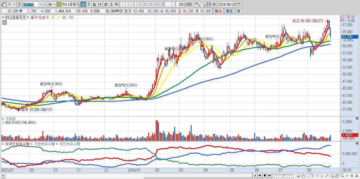 - 하나금융지주 (63,300원 ▼ -4.09% , 시총: 185,062억, 거래량: 1,464,914, 거래대금:931억)