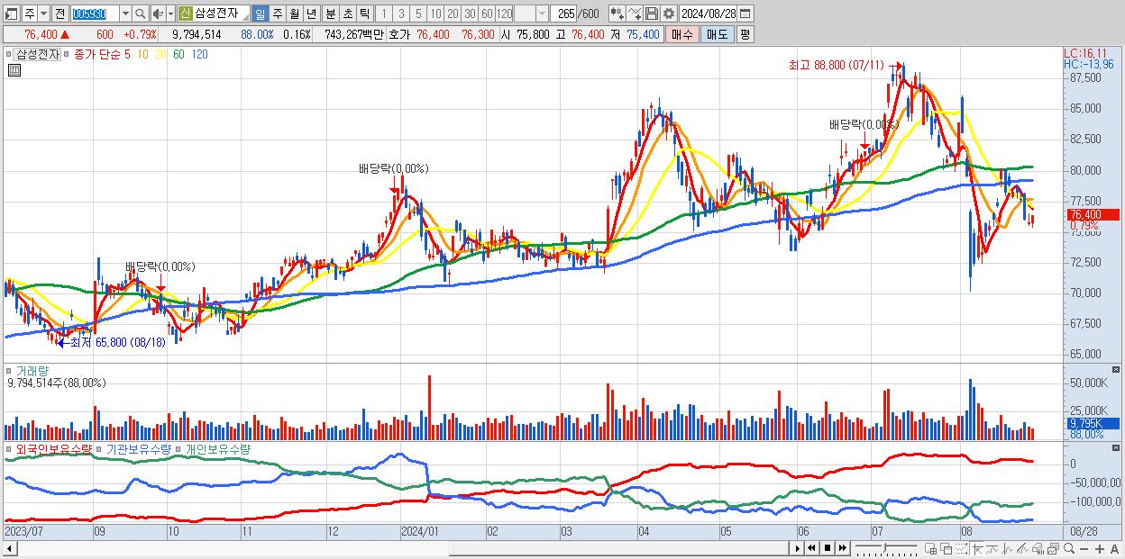 - 삼성전자 (76,400원 ▲ 0.79% , 시총: 4,560,914억, 거래량: 9,794,514, 거래대금:7,433억)