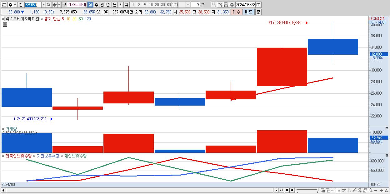 - 넥스트바이오메디컬 (32,800원 ▼ -3.39% , 시총: 2,627억, 거래량: 7,375,059, 거래대금:2,576억)