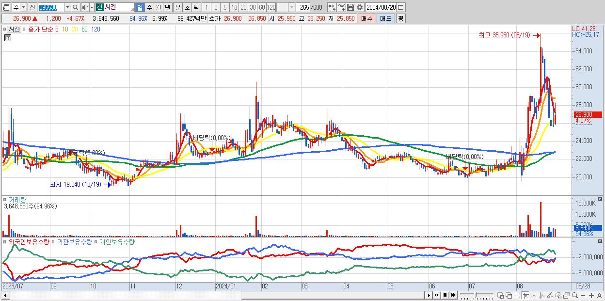 - 씨젠 (26,900원 ▲ 4.67% , 시총: 14,049억, 거래량: 3,648,560, 거래대금:994억)
