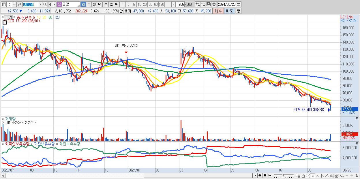 - 금양 (47,500원 ▼ -11.87% , 시총: 27,574억, 거래량: 2,101,652, 거래대금:1,022억)