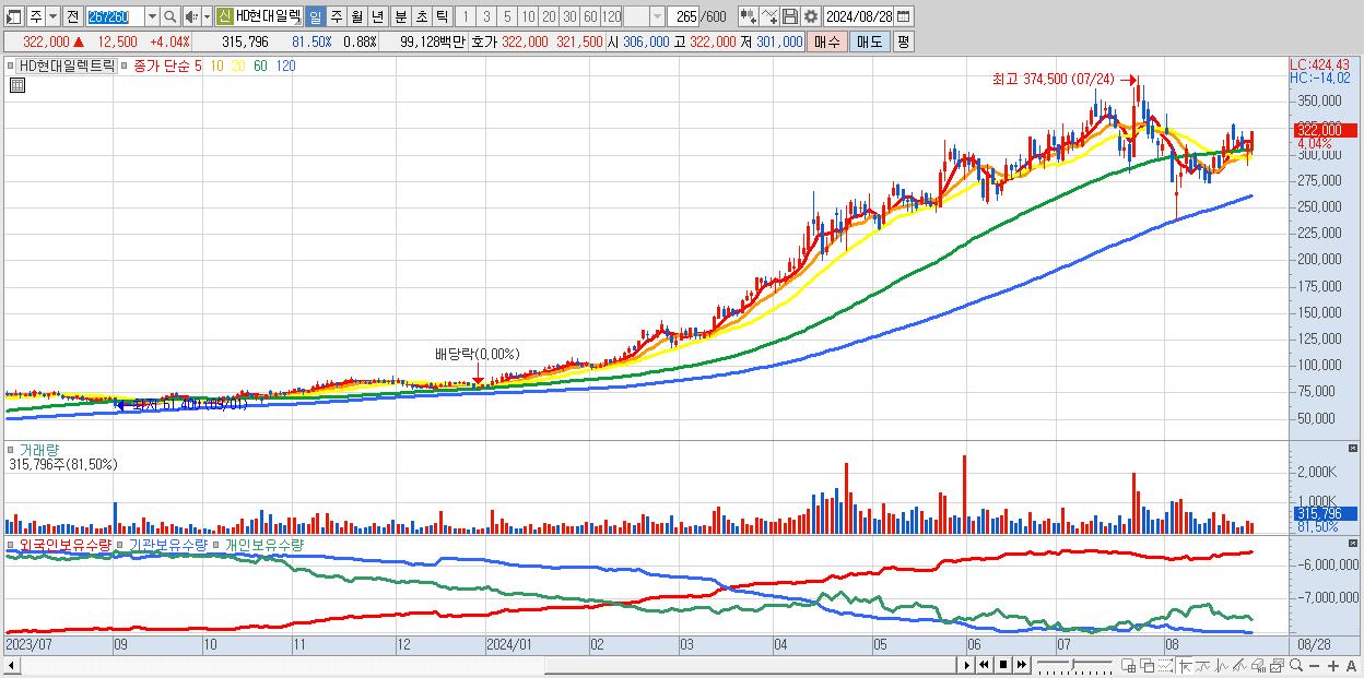 - HD현대일렉트릭 (322,000원 ▲ 4.04% , 시총: 116,072억, 거래량: 315,796, 거래대금:991억)