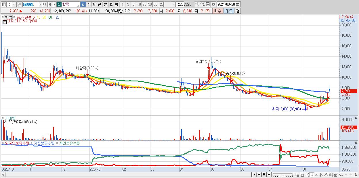 - 한싹 (7,390원 ▲ 3.79% , 시총: 805억, 거래량: 12,189,797, 거래대금:987억)