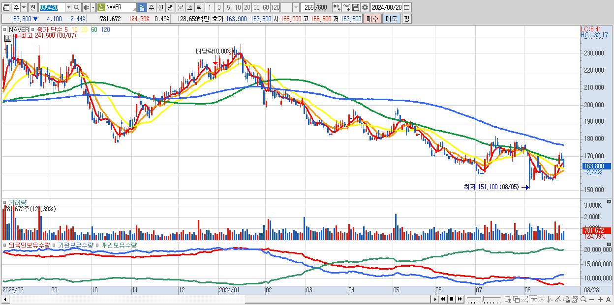 - NAVER (163,800원 ▼ -2.44% , 시총: 263,365억, 거래량: 781,672, 거래대금:1,287억)