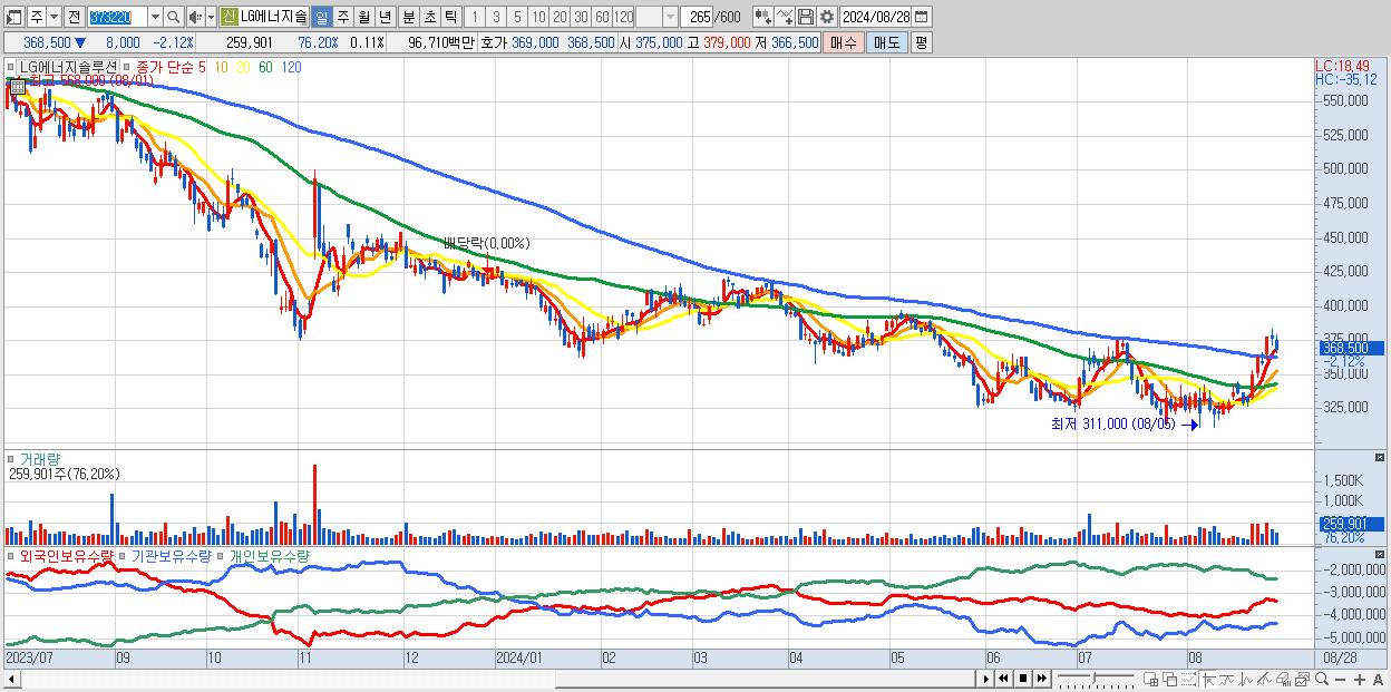 - LG에너지솔루션 (368,500원 ▼ -2.12% , 시총: 862,290억, 거래량: 259,901, 거래대금:967억)