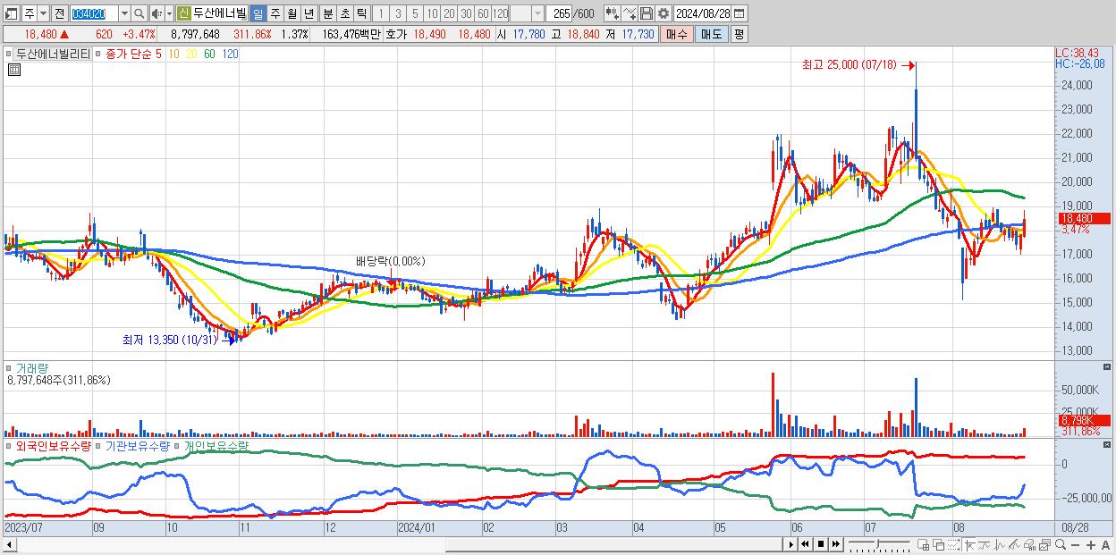- 두산에너빌리티 (18,480원 ▲ 3.47% , 시총: 118,376억, 거래량: 8,797,648, 거래대금:1,635억)