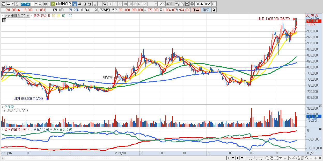 - 삼성바이오로직스 (991,000원 ▲ 1.85% , 시총: 705,334억, 거래량: 171,180, 거래대금:1,701억)