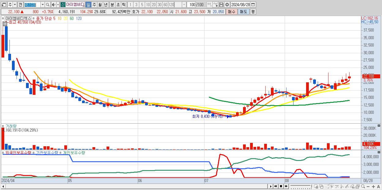 - 아이엠비디엑스 (22,100원 ▲ 3.76% , 시총: 3,098억, 거래량: 4,160,191, 거래대금:924억)