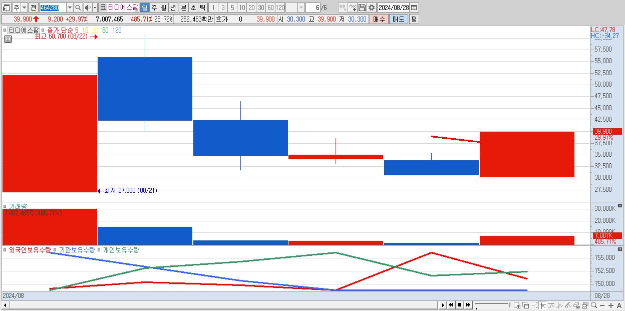 - 티디에스팜 (39,900원 ▲ 29.97% , 시총: 2,206억, 거래량: 7,007,465, 거래대금:2,525억)