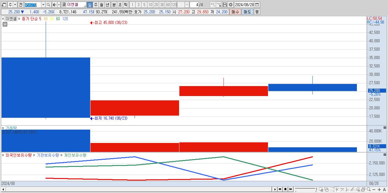- 이엔셀 (25,200원 ▼ -5.26% , 시총: 2,356억, 거래량: 8,721,146, 거래대금:2,416억)