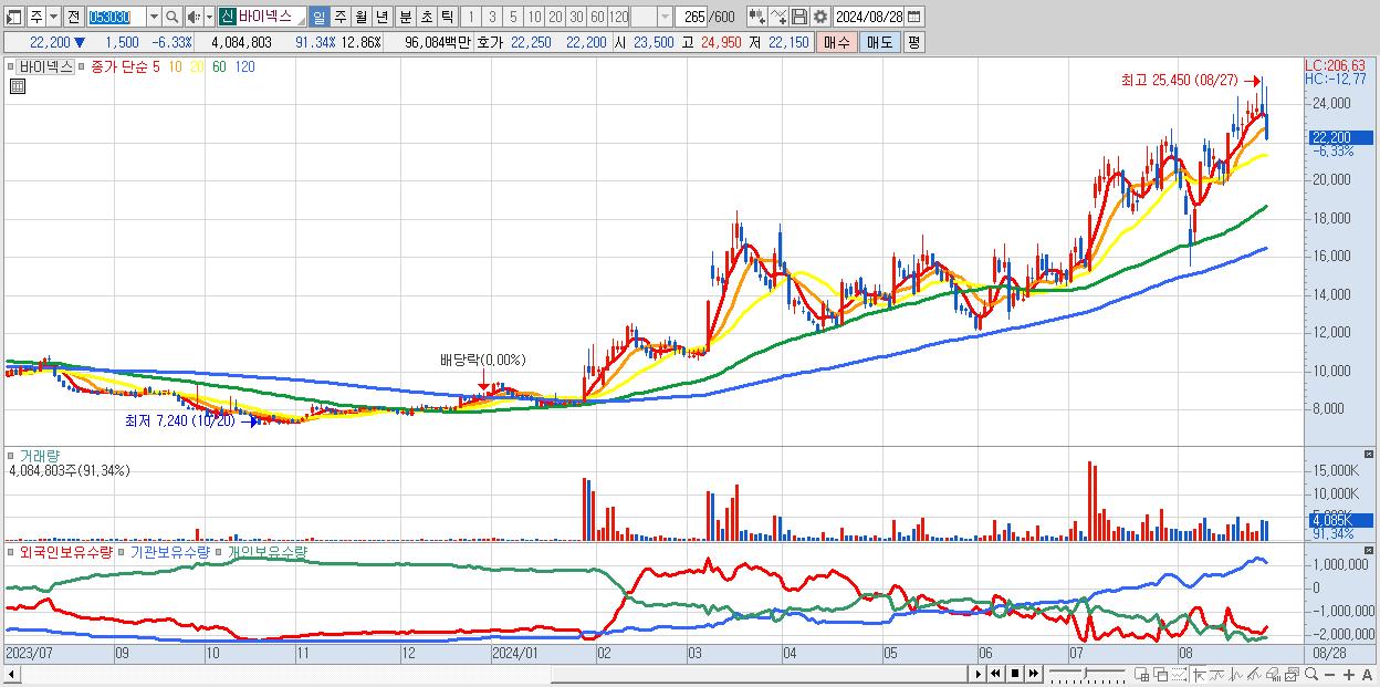 - 바이넥스 (22,200원 ▼ -6.33% , 시총: 7,051억, 거래량: 4,084,803, 거래대금:961억)