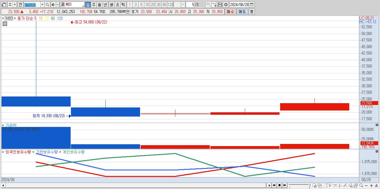 - M83 (23,500원 ▲ 17.21% , 시총: 1,829억, 거래량: 12,043,253, 거래대금:2,858억)