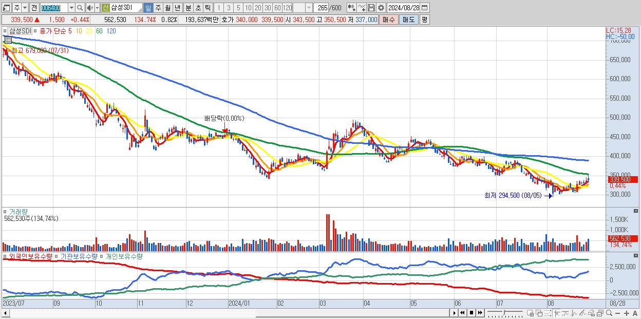 - 삼성SDI (339,500원 ▲ 0.44% , 시총: 233,456억, 거래량: 562,530, 거래대금:1,936억)