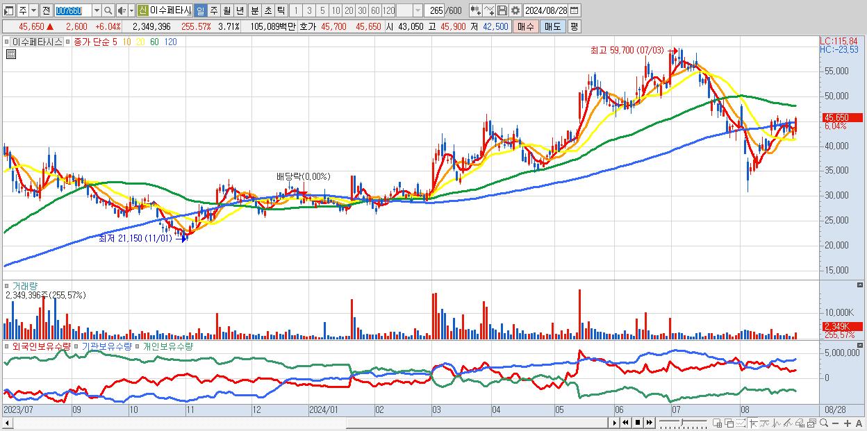 - 이수페타시스 (45,650원 ▲ 6.04% , 시총: 28,872억, 거래량: 2,349,396, 거래대금:1,051억)