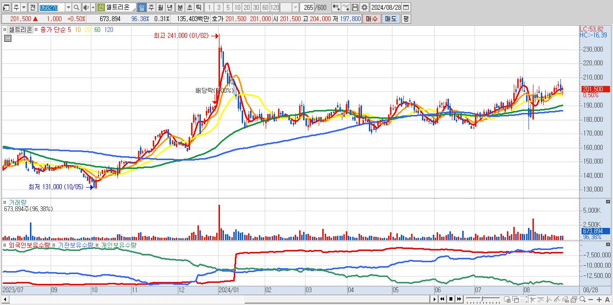 - 셀트리온 (201,500원 ▲ 0.5% , 시총: 437,298억, 거래량: 673,894, 거래대금:1,354억)