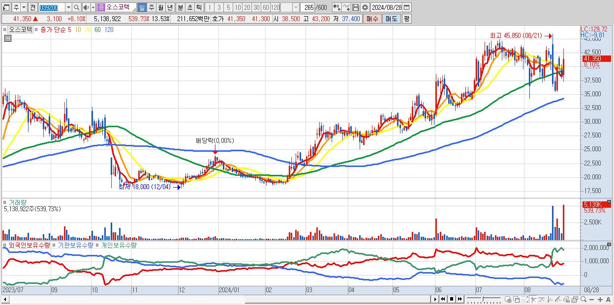 - 오스코텍 (41,350원 ▲ 8.1% , 시총: 15,711억, 거래량: 5,138,922, 거래대금:2,117억)