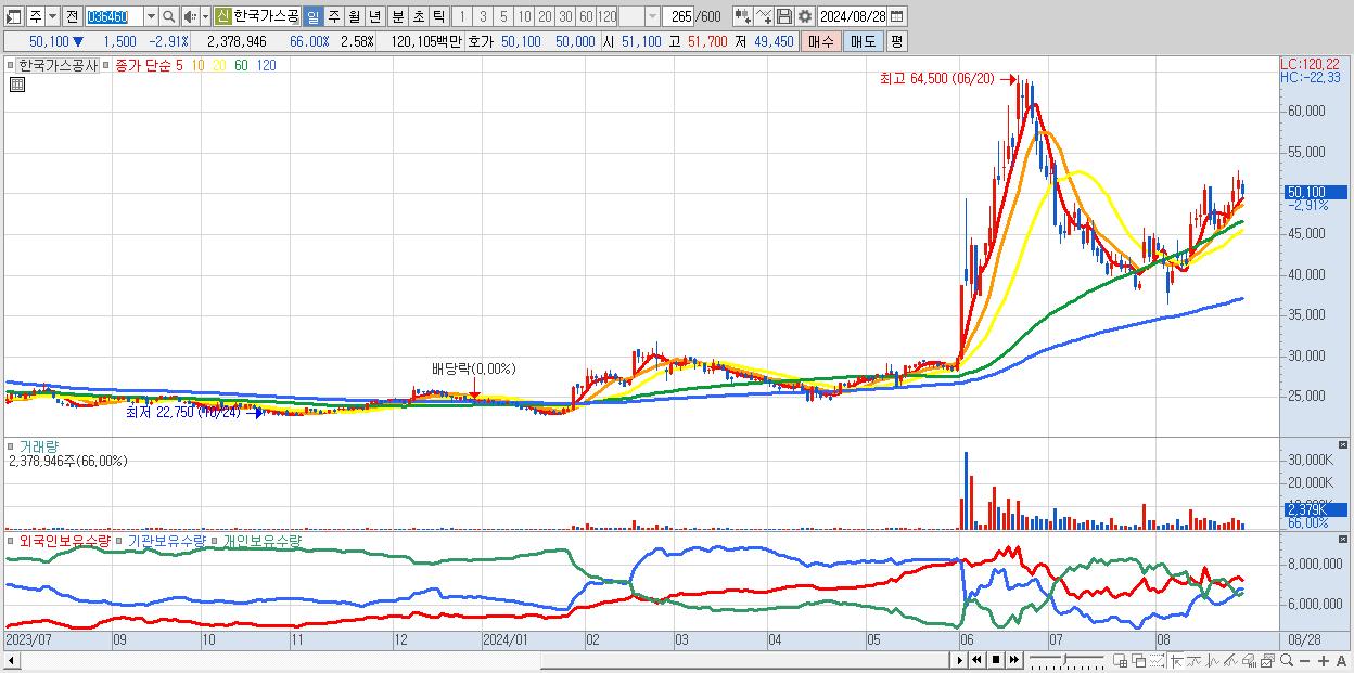 - 한국가스공사 (50,100원 ▼ -2.91% , 시총: 46,249억, 거래량: 2,378,946, 거래대금:1,201억)