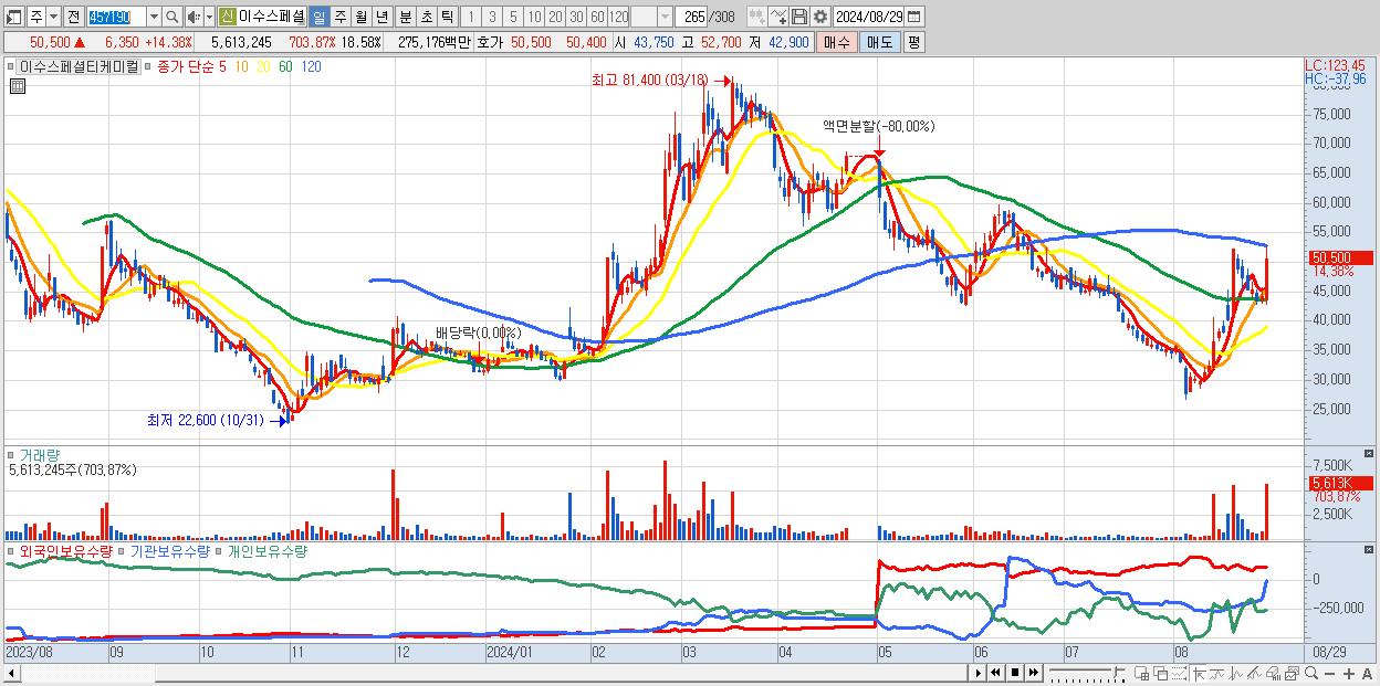 - 이수스페셜티케미컬 (50,500원 ▲ 14.38% , 시총: 15,255억, 거래량: 5,613,245, 거래대금:2,752억)