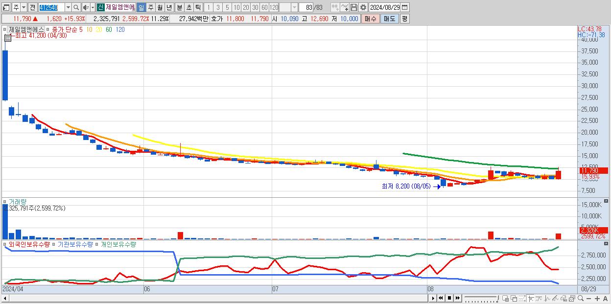 - 제일엠앤에스 (11,790원 ▲ 15.93% , 시총: 2,429억, 거래량: 2,325,791, 거래대금:279억)