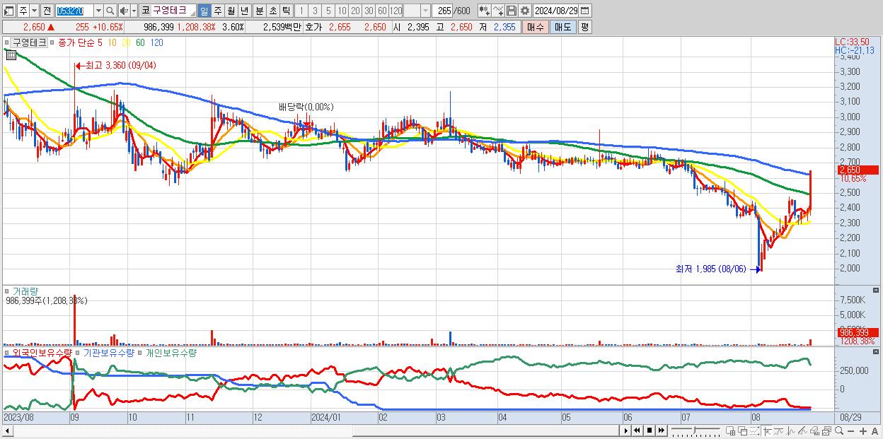 - 구영테크 (2,650원 ▲ 10.65% , 시총: 726억, 거래량: 986,399, 거래대금:25억)