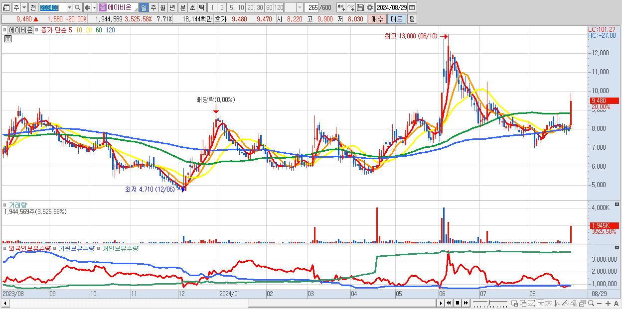 - 에이비온 (9,480원 ▲ 20% , 시총: 2,391억, 거래량: 1,944,569, 거래대금:181억)